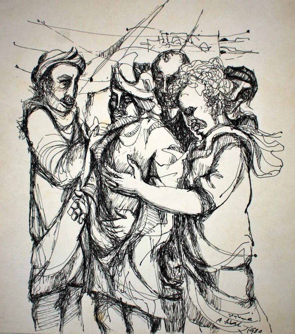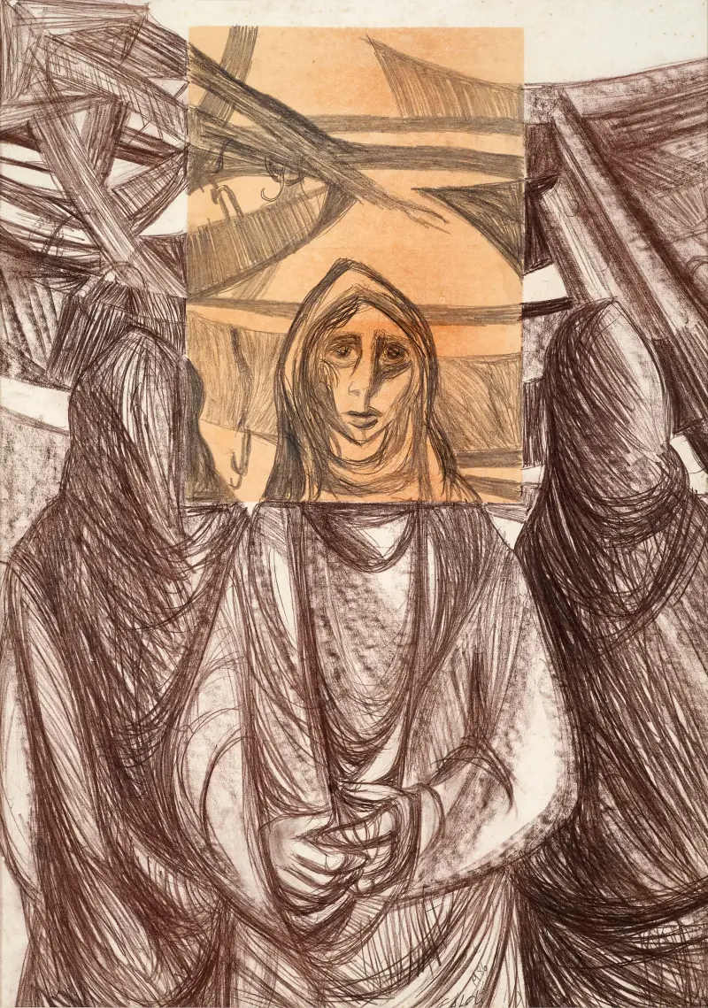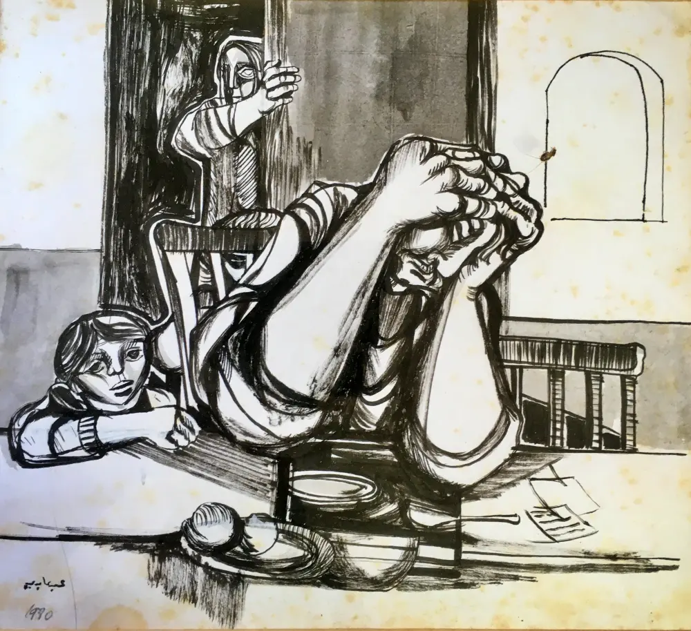 This section presents Abed Abdi’s artworks from the 1980s — a decade in which he was deeply engaged in teaching art and art history in Haifa and other localities. While shaping the next generation of Palestinian artists, Abdi also continued to develop his own visual language rooted in collective memory and resistance.