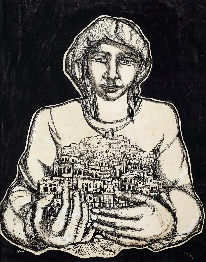 One of the most significant artistic milestones of this period is the Wama Nasina (“And We Have Not Forgotten”) series. As Tal Ben Zvi writes, these works “form a visual archive of memory, where the trauma of the Nakba and the endurance of Palestinian identity intersect with symbols of continuity, exile, and rootedness.”