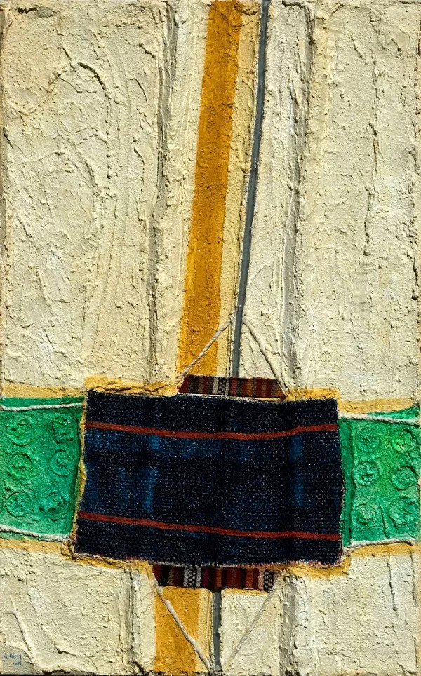 الرسم 7 طيّات خيش، 2010 دبق خزفي، رمل، قماش خيش وحبال على قماش 80X100 سم |