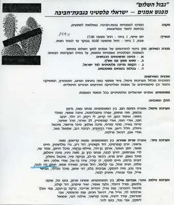 Peace Gallery, Givat Haviva Art Center1 June, 1990 – 2 June, 1990Artists: Eshet, Pinchas  |  Gechtman, Gideon  |  Mehutan, Hava  |  Zimbalista, Ofra  |  Shimshi, Siona  |  Nachmani, Naftali  |  Kna’an, Ahmed  |  Karavan, Dani  |  Heller, Dov  |  Hefetz, Yaakov  |  Hofi, Uri  |  Katzenstein, Uri  |  Or Ner, Dov  |  Spitzer, Serge  |...